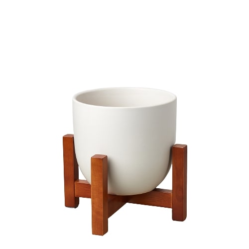 Ceramic Contour Pot with Wood Stand - 7 Inch - Elevated Elegance Planter for 6 Inch Plants
